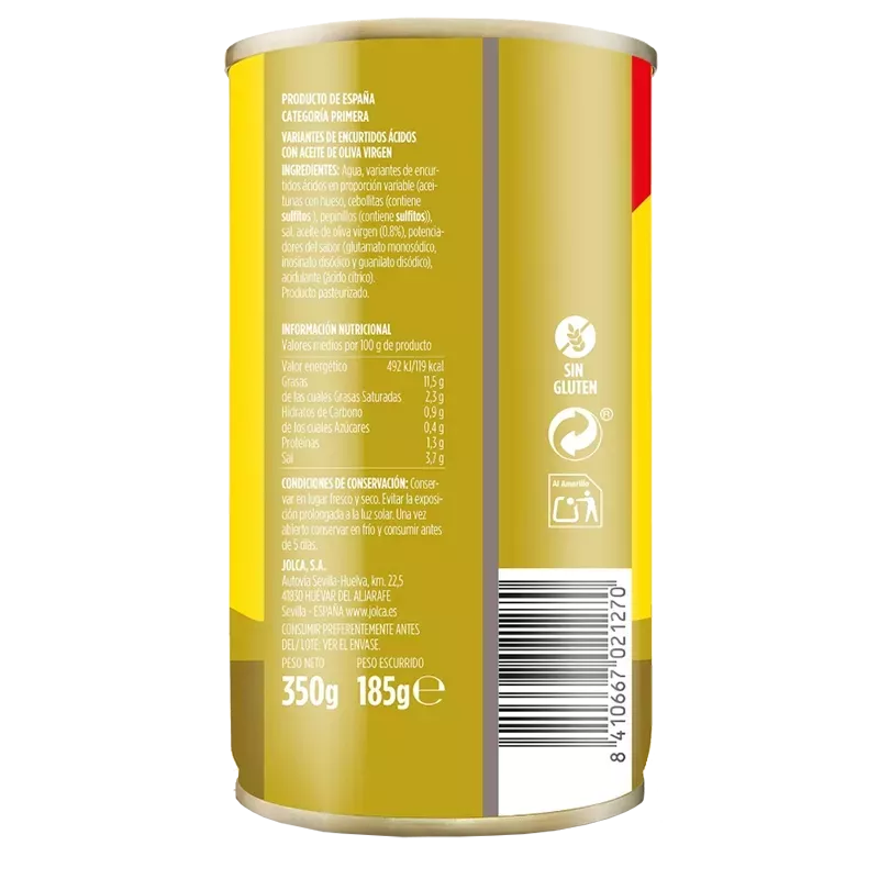 Eau, variantes marinées à l'acide en proportions variables (olives avec noyaux, oignons (contient des sulfites), cornichons (contient des sulfites)), sel, huile d'olive vierge (0,8%), exhausteurs de goût (glutamate monosodique, inosinate disodique et guanylate disodique), acidifiant (acide citrique).